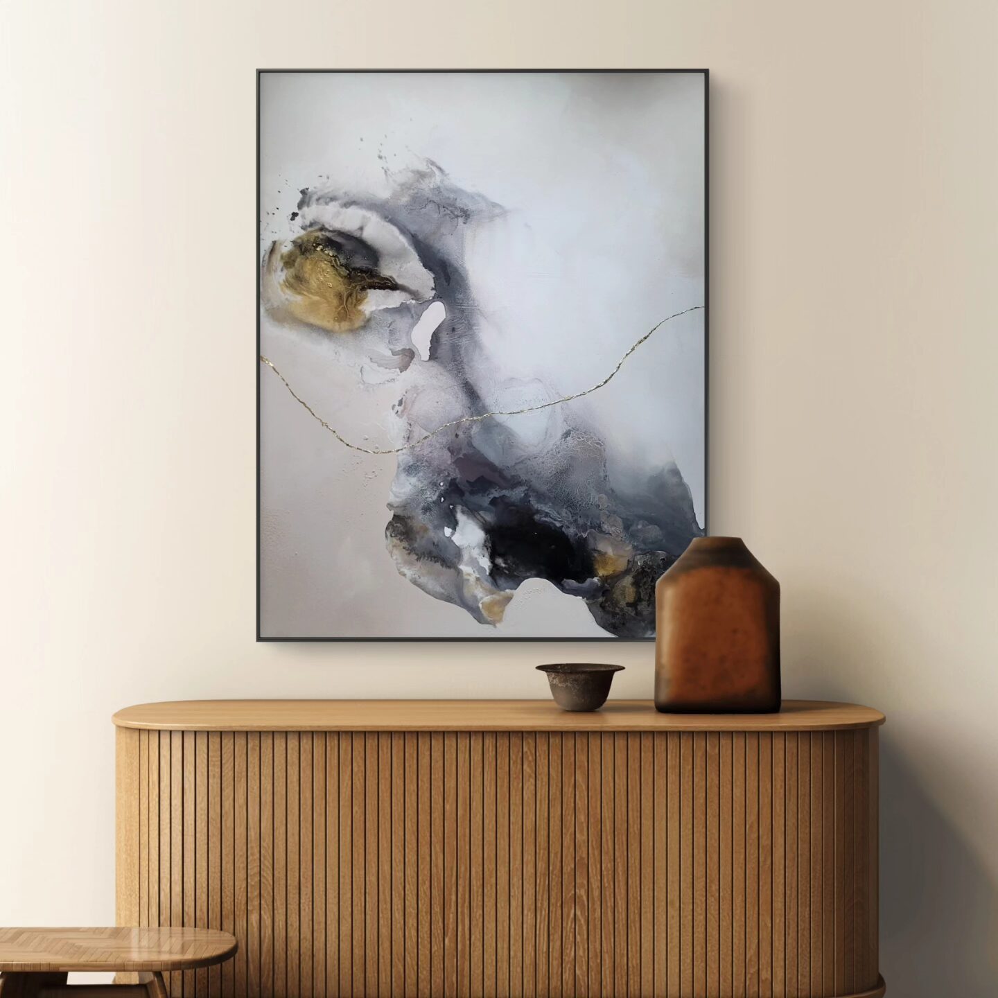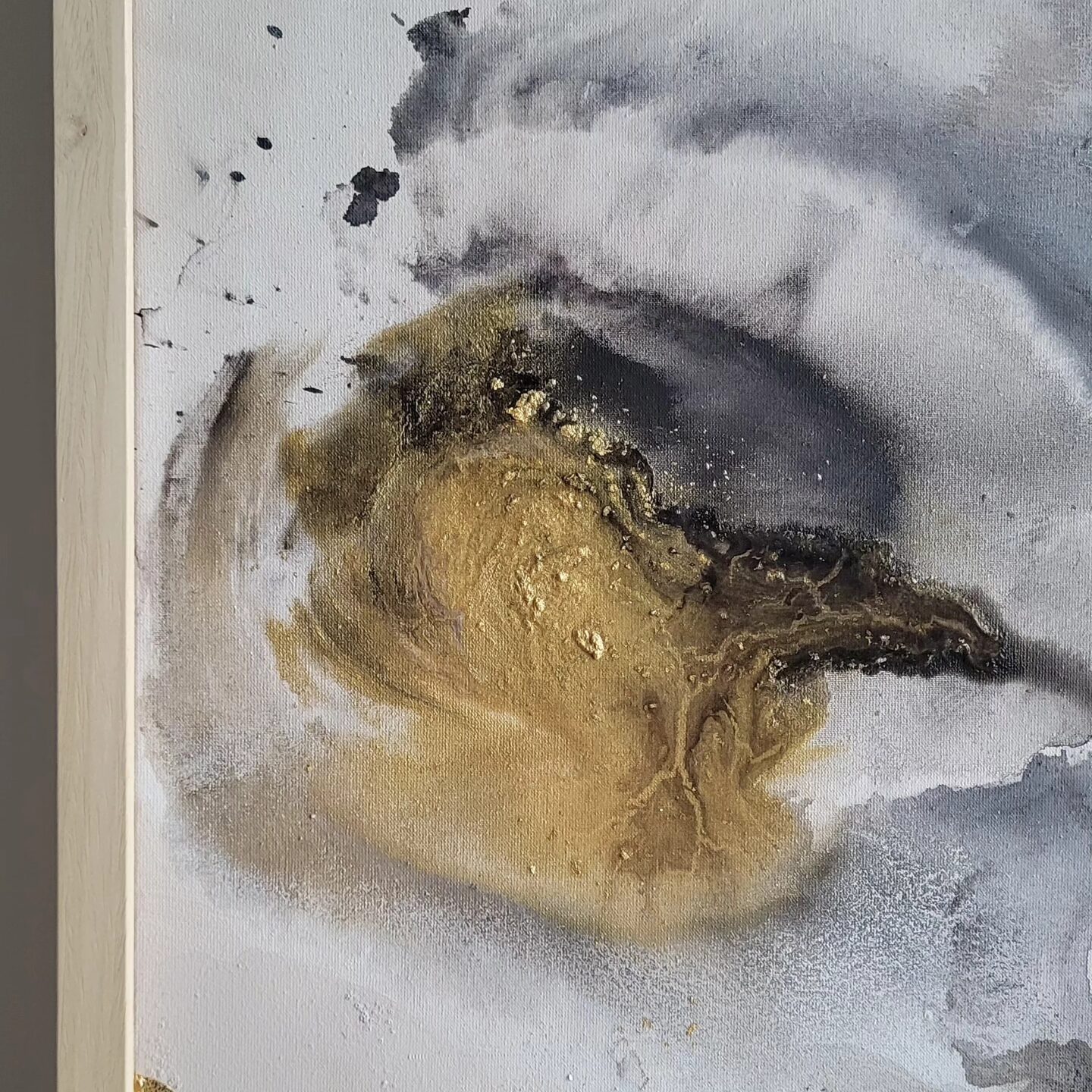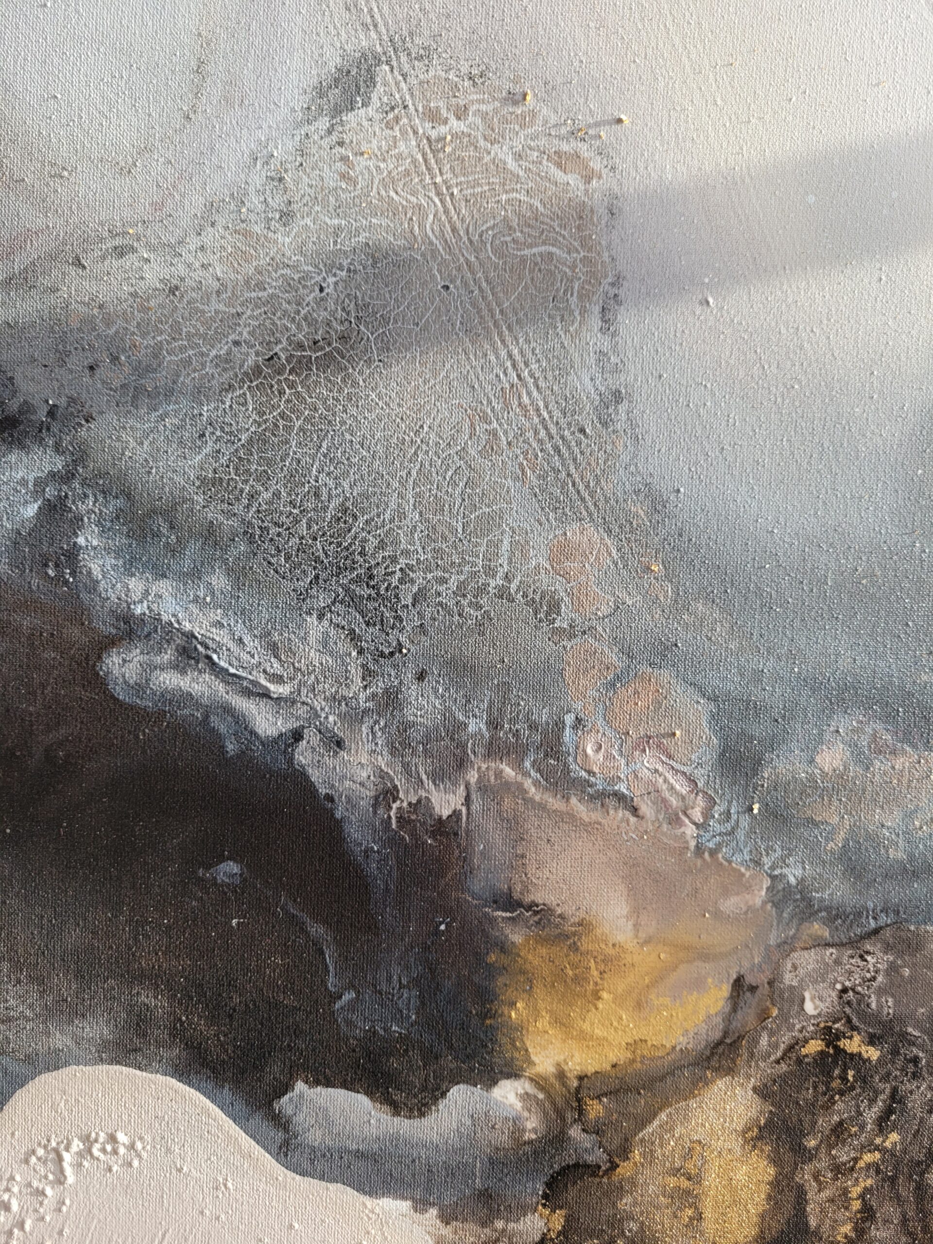 „Balans” 100 x 80 cm, media mieszane i detale ze szlagmetalu. Oto kwintesencja harmonii i spokoju, okiełznany chaos. Ta zbalansowana kompozycja doda charakteru każdemu wnętrzu. Bogate detale zapraszają do częstych kontemplacji tego dzieła.