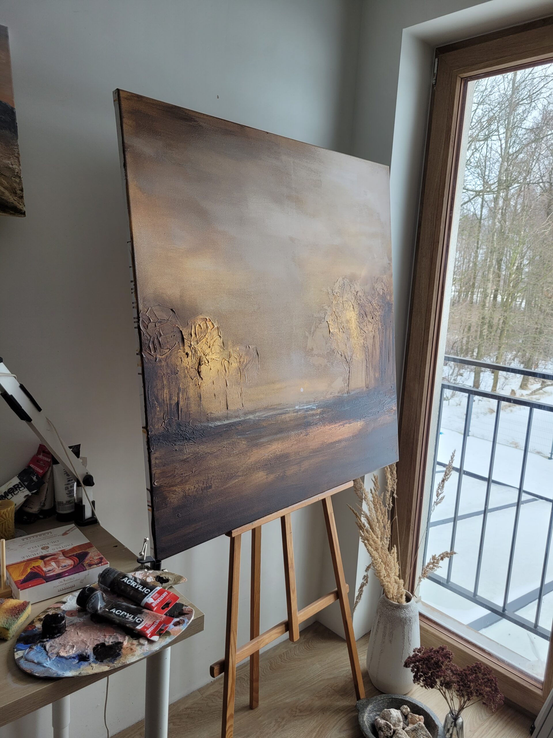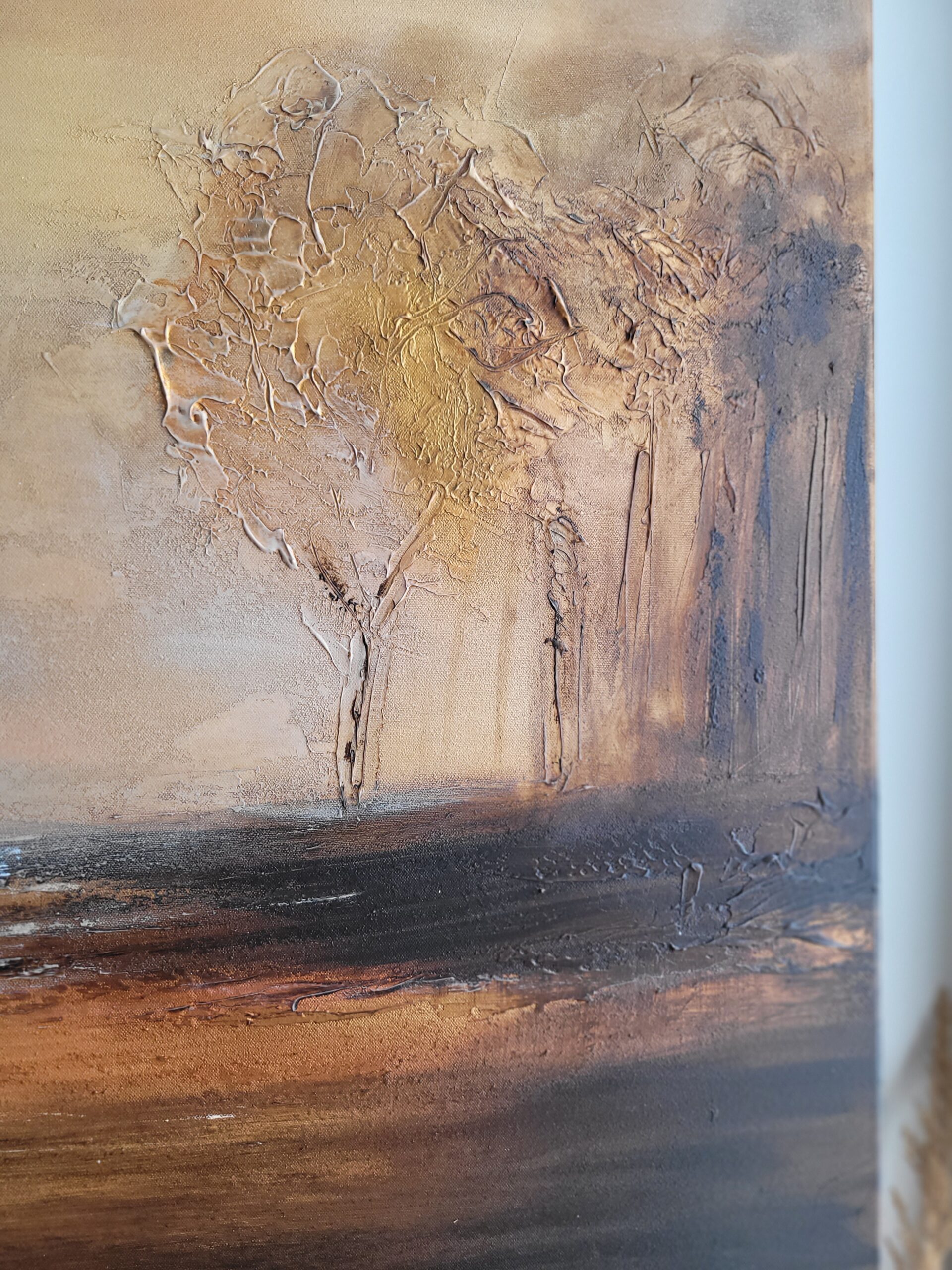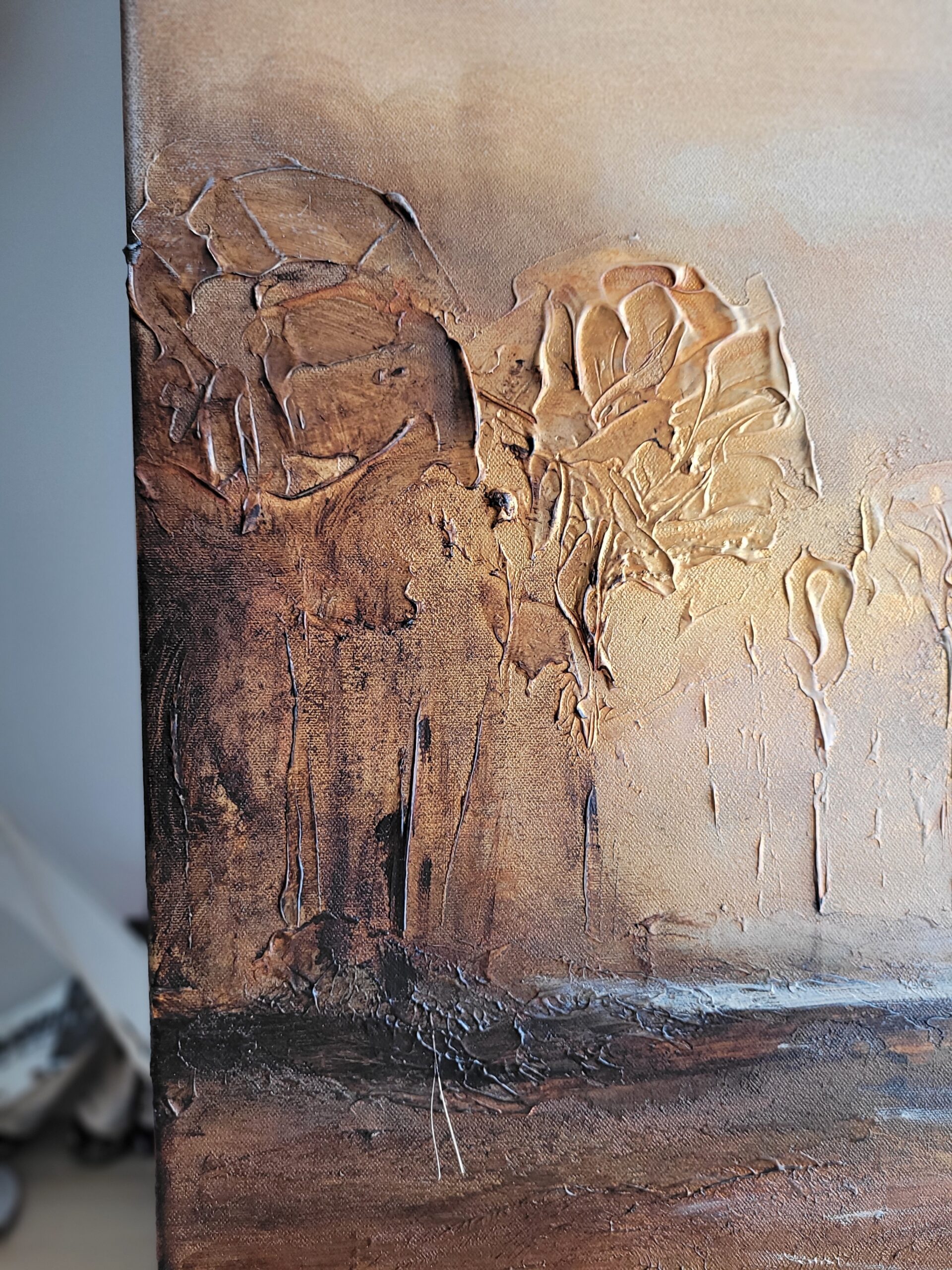 Złote i ziemiste tony budują atmosferę ciepła oraz bezpieczeństwa. Faktura obrazu dodaje głębi i organiczności, podkreślając naturalny charakter obrazu; niemal na wyciągnięcie ręki. Metaliczne pigmenty grają ze światłem wprowadzając niezwykle ciekawe detale.