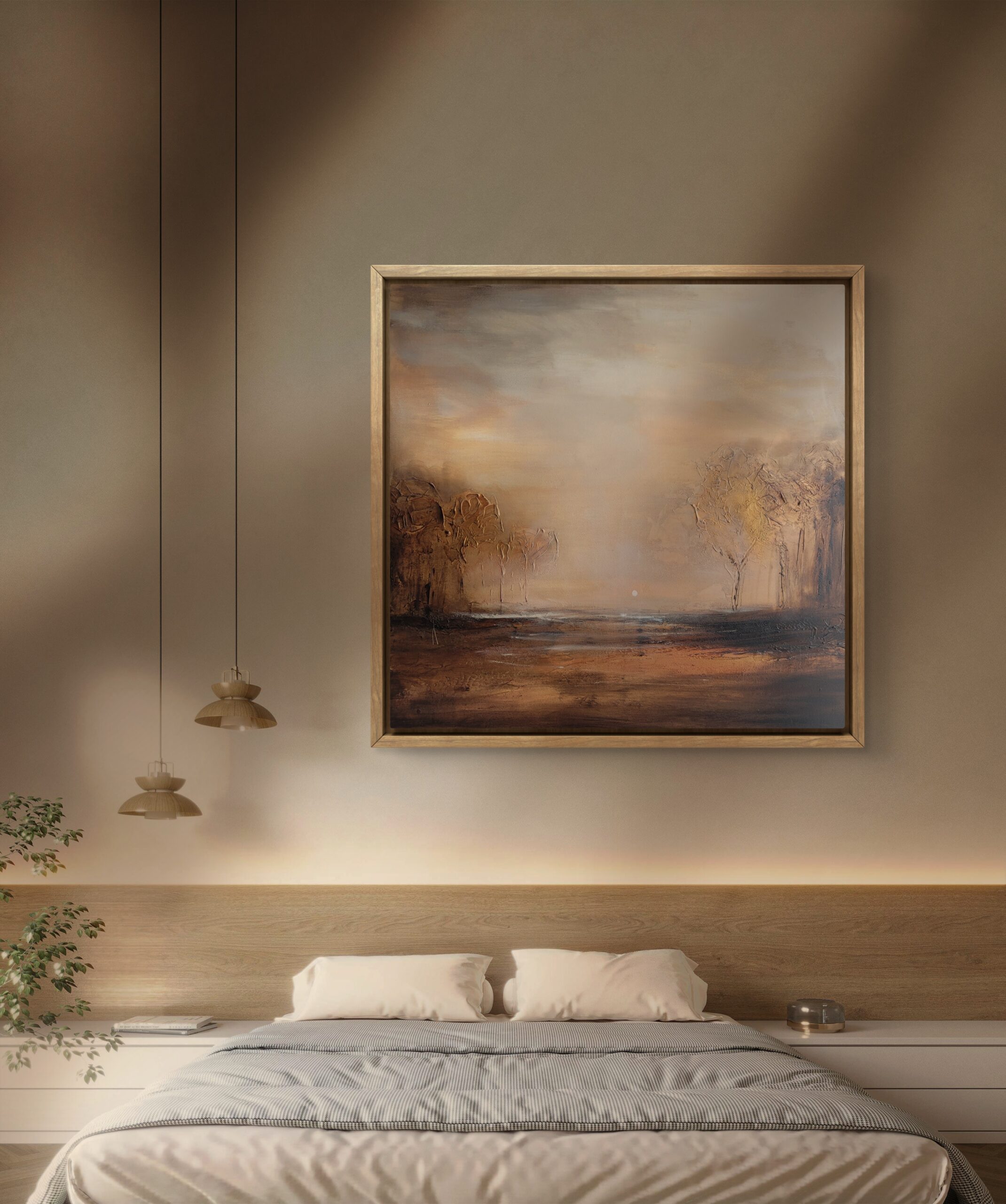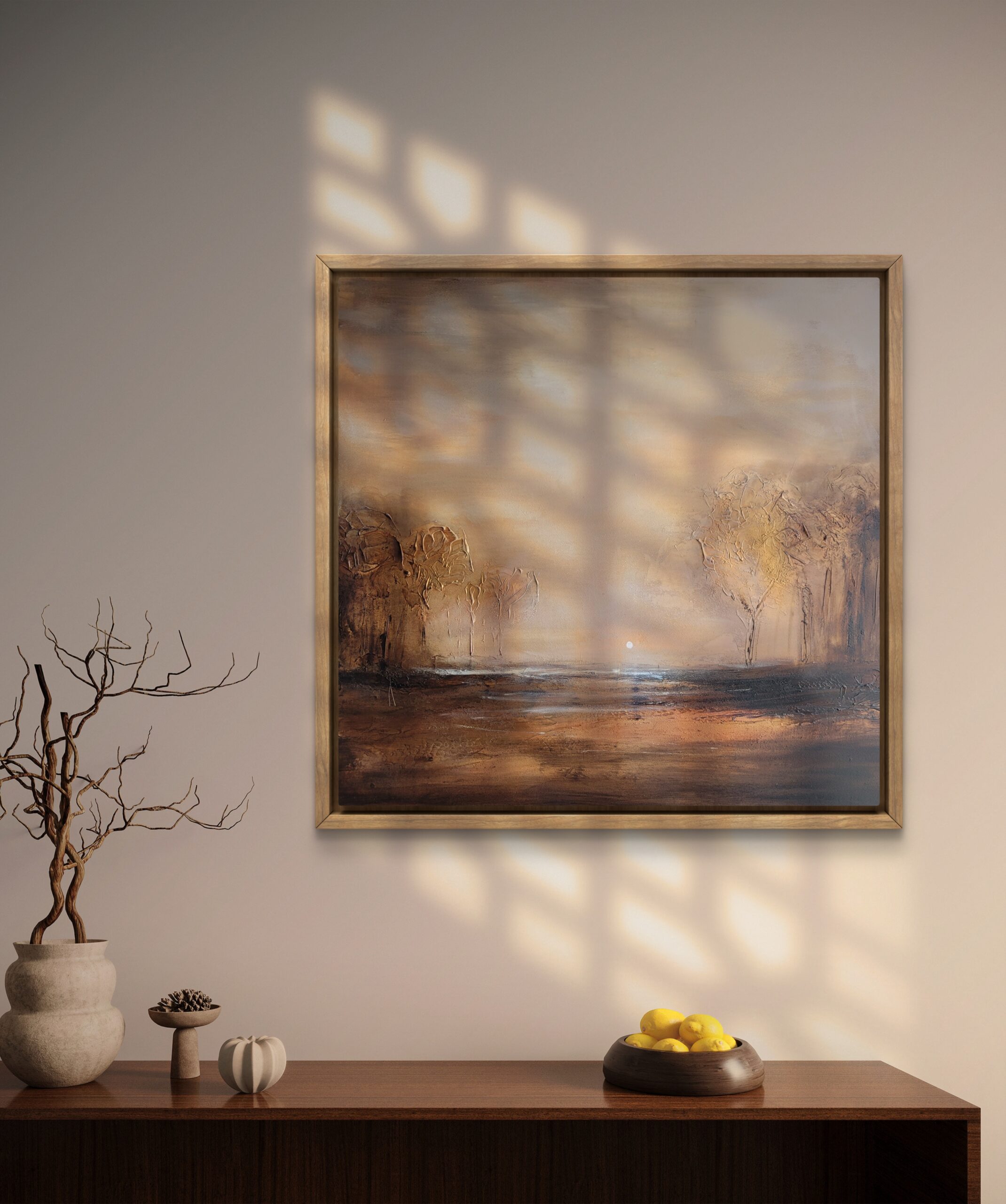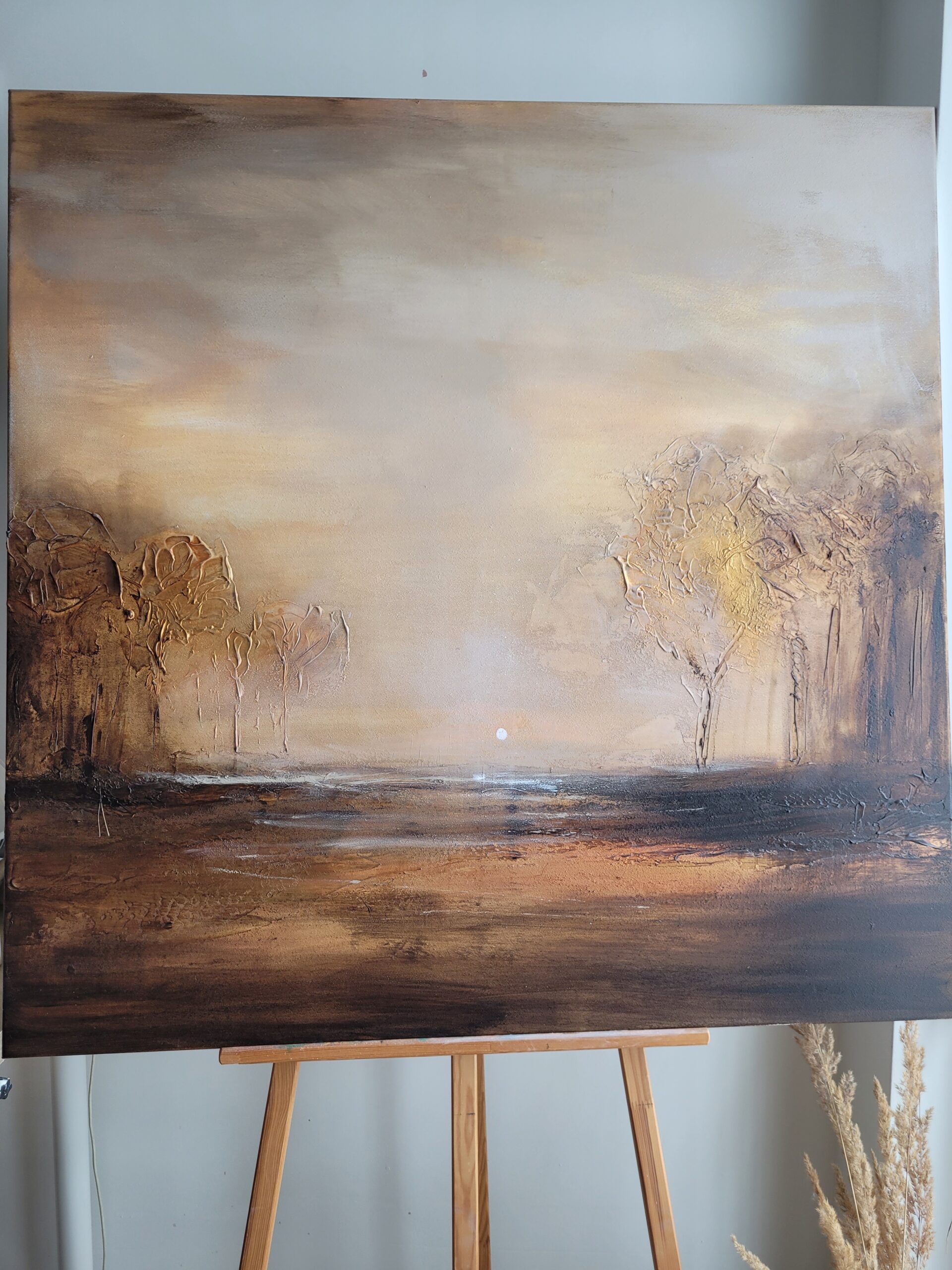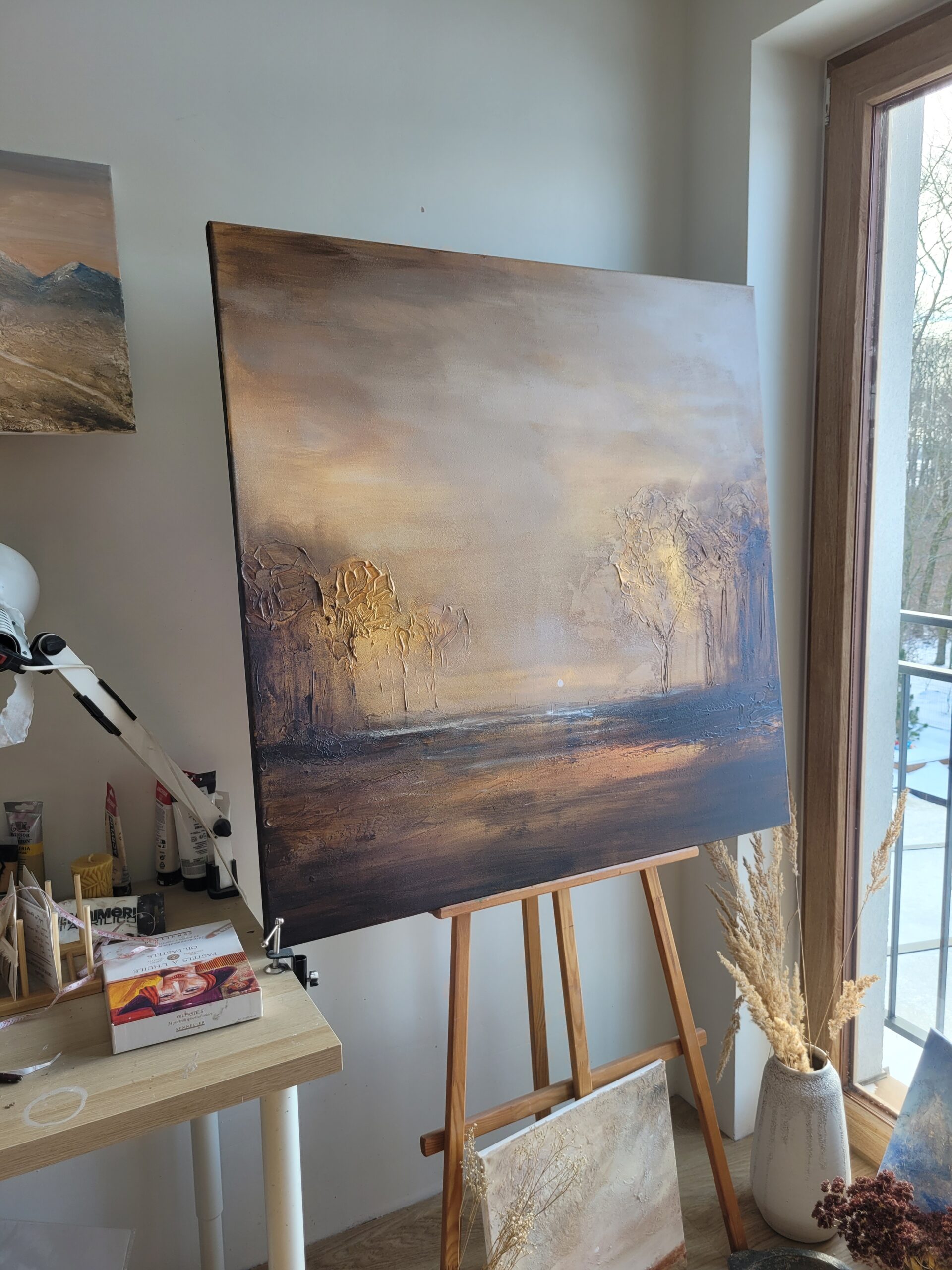 Złote i ziemiste tony budują atmosferę ciepła oraz bezpieczeństwa. Faktura obrazu dodaje głębi i organiczności, podkreślając naturalny charakter obrazu; niemal na wyciągnięcie ręki. Metaliczne pigmenty grają ze światłem wprowadzając niezwykle ciekawe detale.