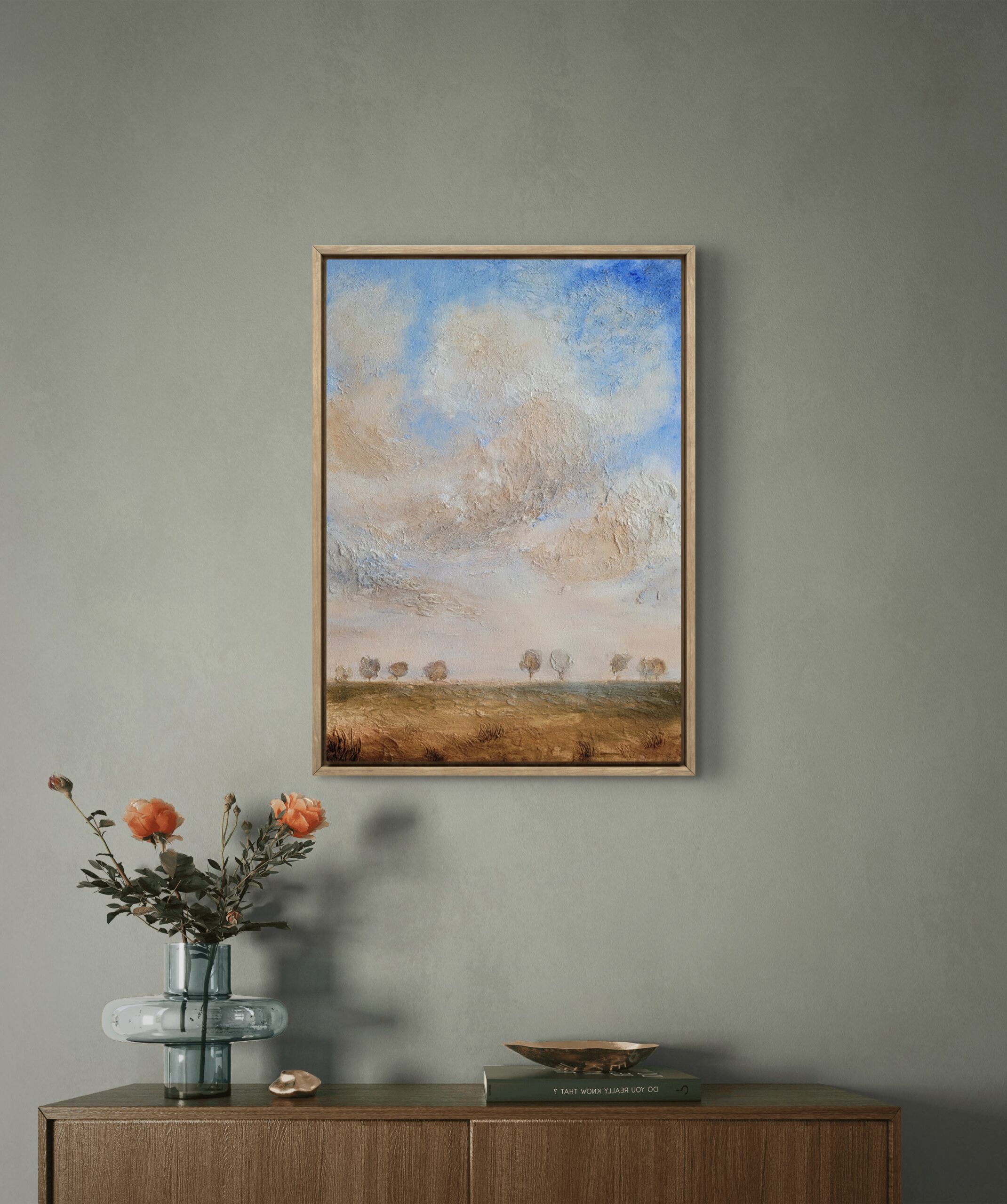 Ten piekny pejzaż łączy subtelne faktury z delikatną paletą barw ziemi i nieba. Strukturalna powierzchnia i miękkie przejścia kolorystyczne tworzą poczucie głębi i atmosfery – jakby czas zatrzymał się na moment tuż przed zmierzchem lub zaraz po świcie.