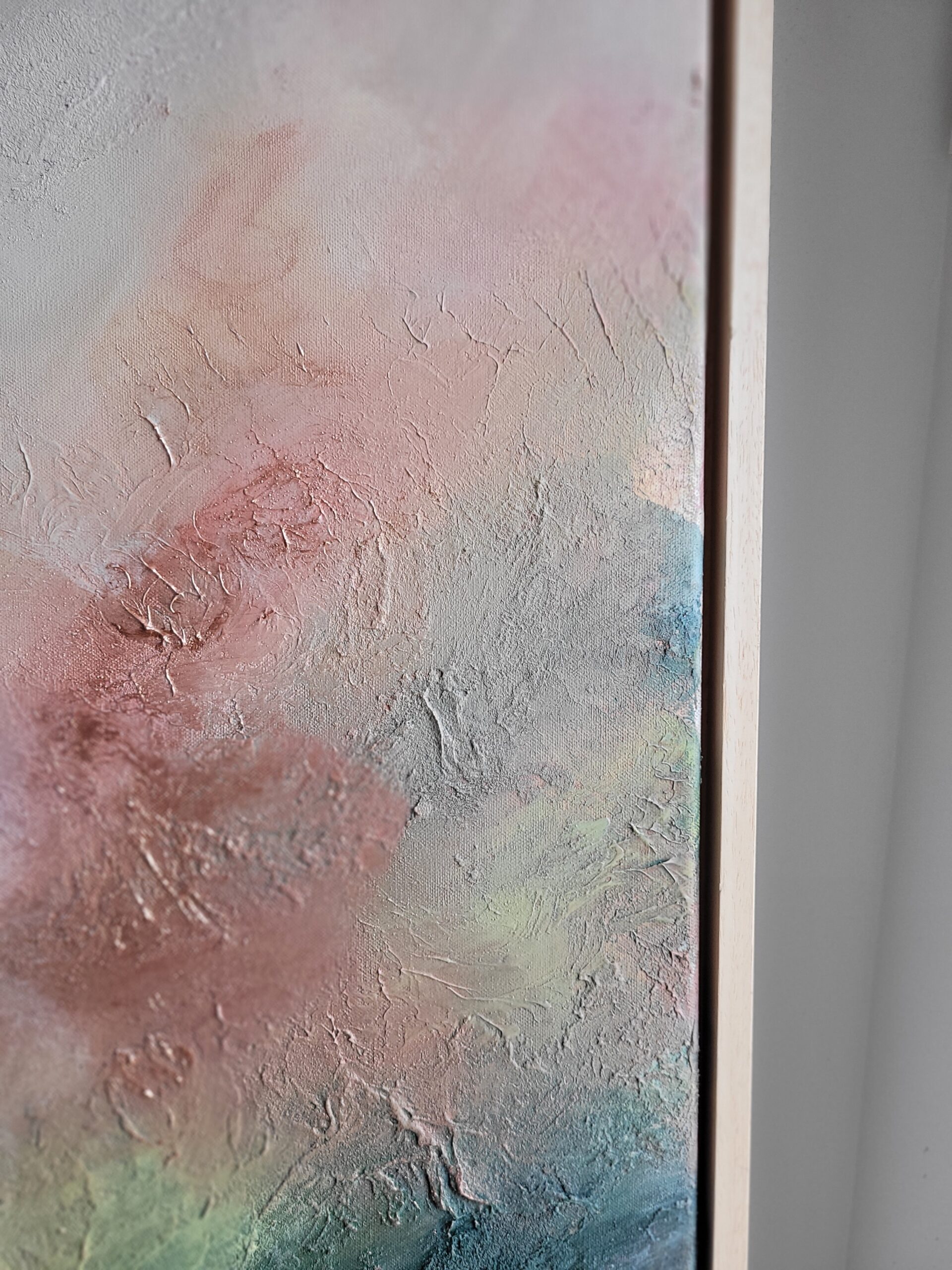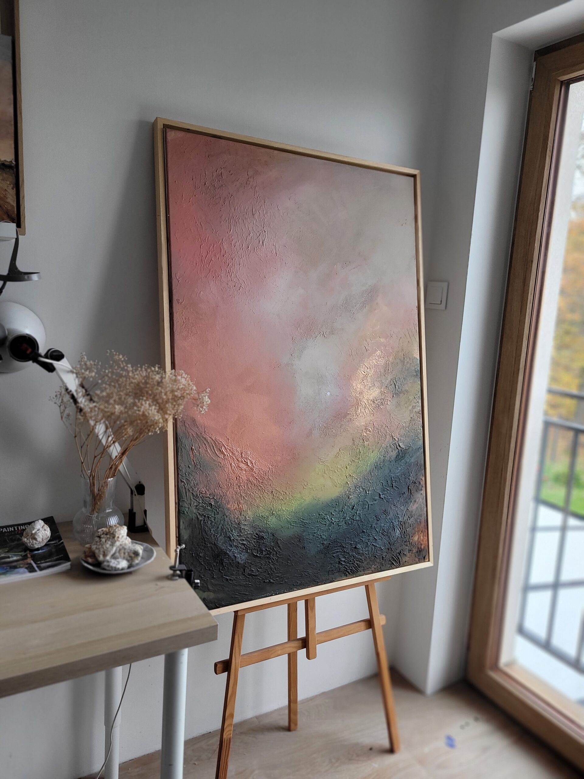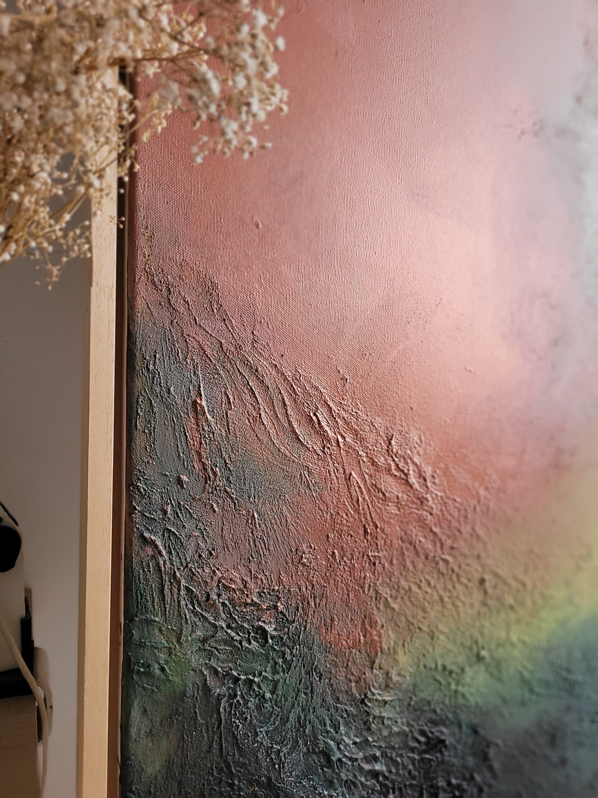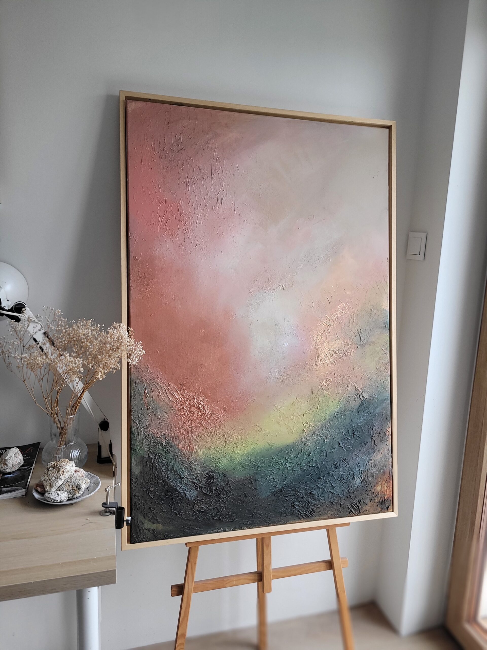 „Wschód księżyca” to abstrakcyjna kompozycja pełna subtelnych przejść kolorów i faktur, które oddają magiczny moment narodzin światła na nocnym niebie. Ciepłe odcienie różu i pomarańczu płynnie przenikają się z chłodnymi tonami zieleni i granatu, tworząc harmonijną, niemal kosmiczną aurę.