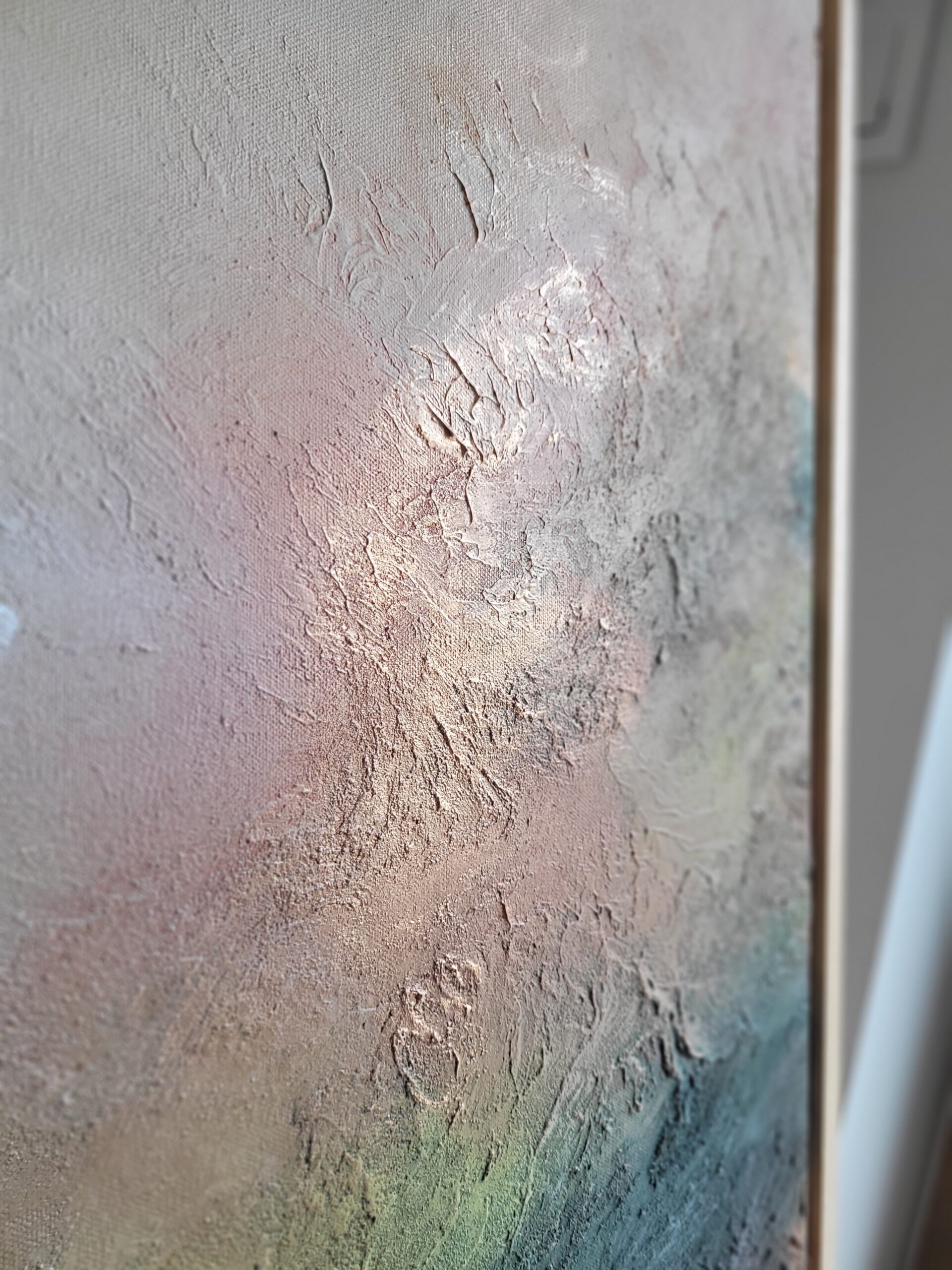 „Wschód Księżyca 4”, wym. 120 x 80 x 2 cm, akryl i pasty strukturalne, 2025 Oryginalny, ręcznie malowany obraz strukturalny na bawełnianym płótnie. „Wschód księżyca” to abstrakcyjna kompozycja pełna subtelnych przejść kolorów i faktur, które oddają magiczny moment narodzin światła na nocnym niebie. Ciepłe odcienie różu i pomarańczu płynnie przenikają się z chłodnymi tonami zieleni…