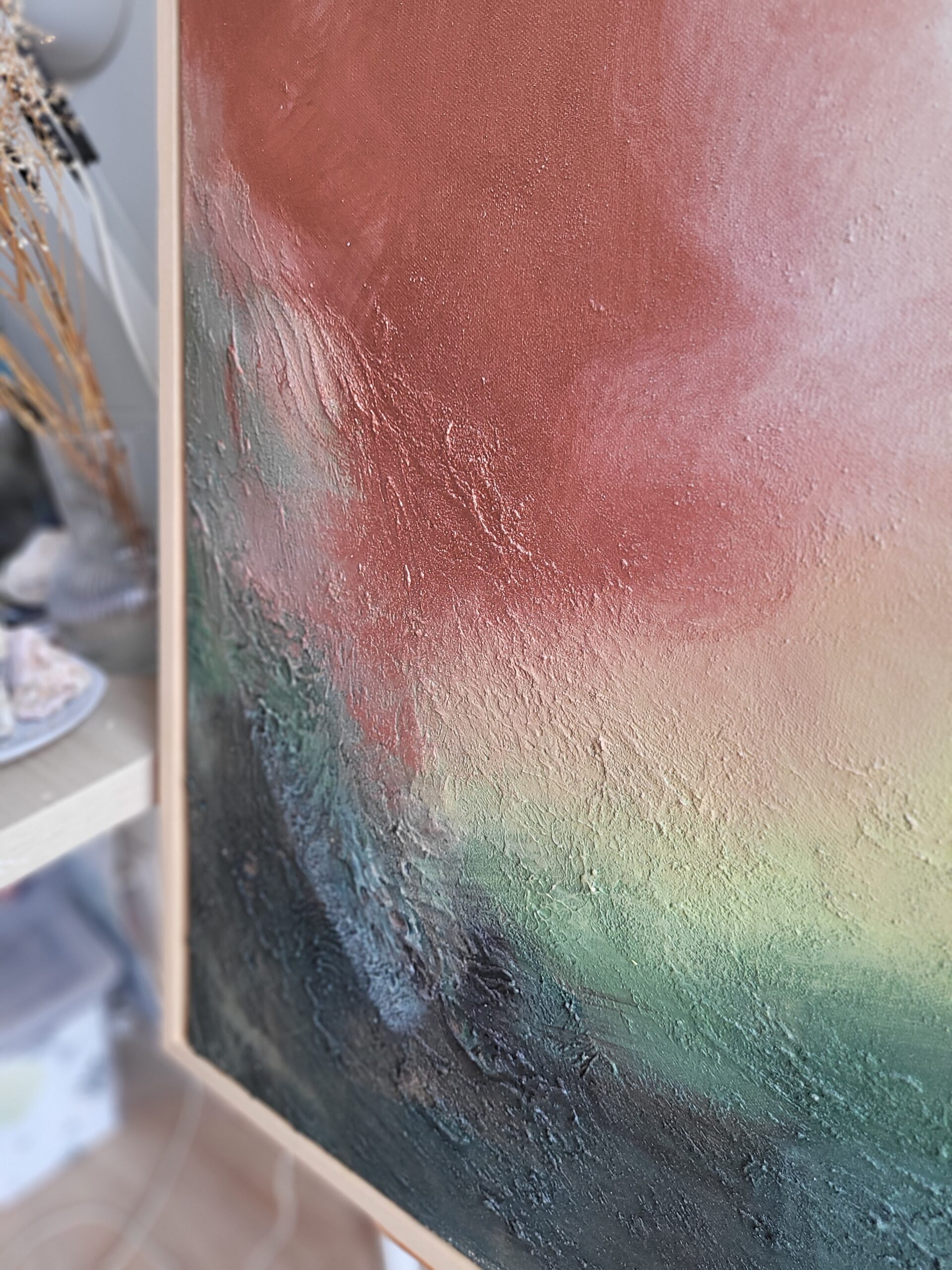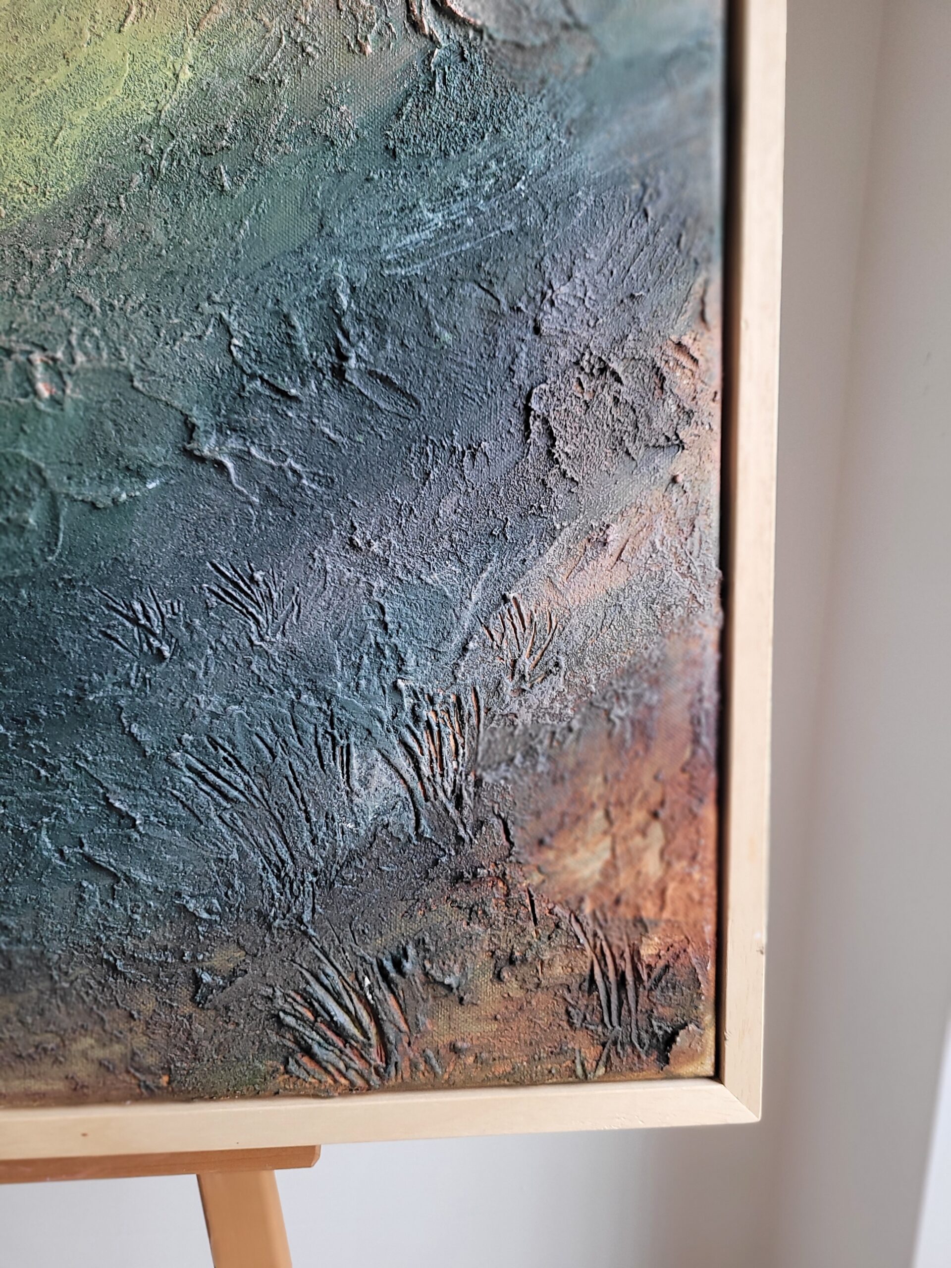 Gruba, strukturalna faktura oraz metaliczne pigmenty nadają dziełu głębi i dynamiki, a zarazem pozwalają widzowi odczuć spokój chwili.