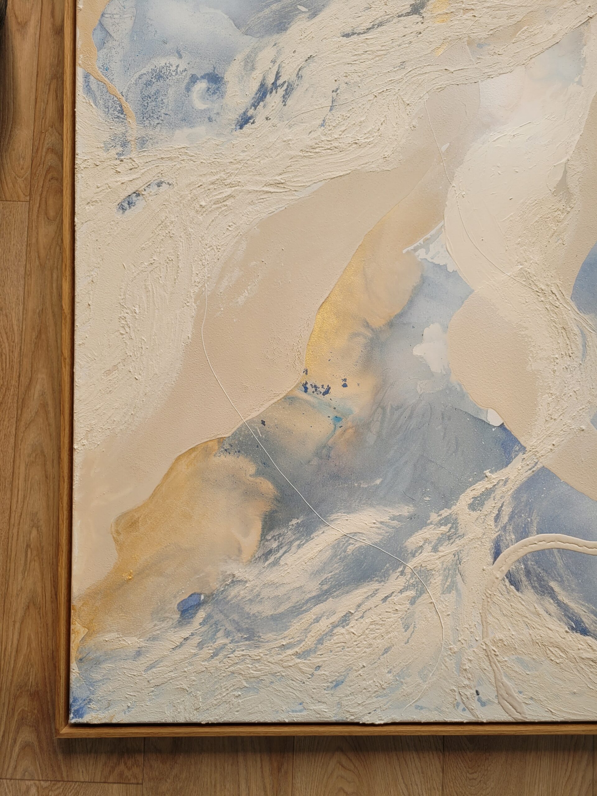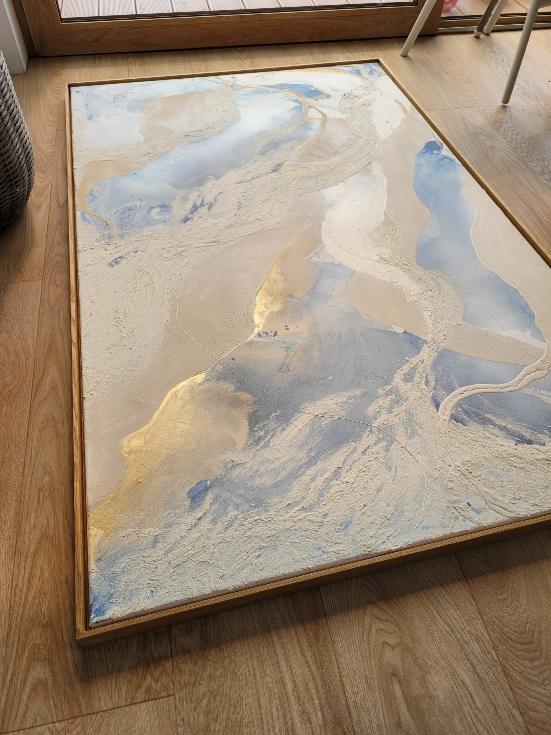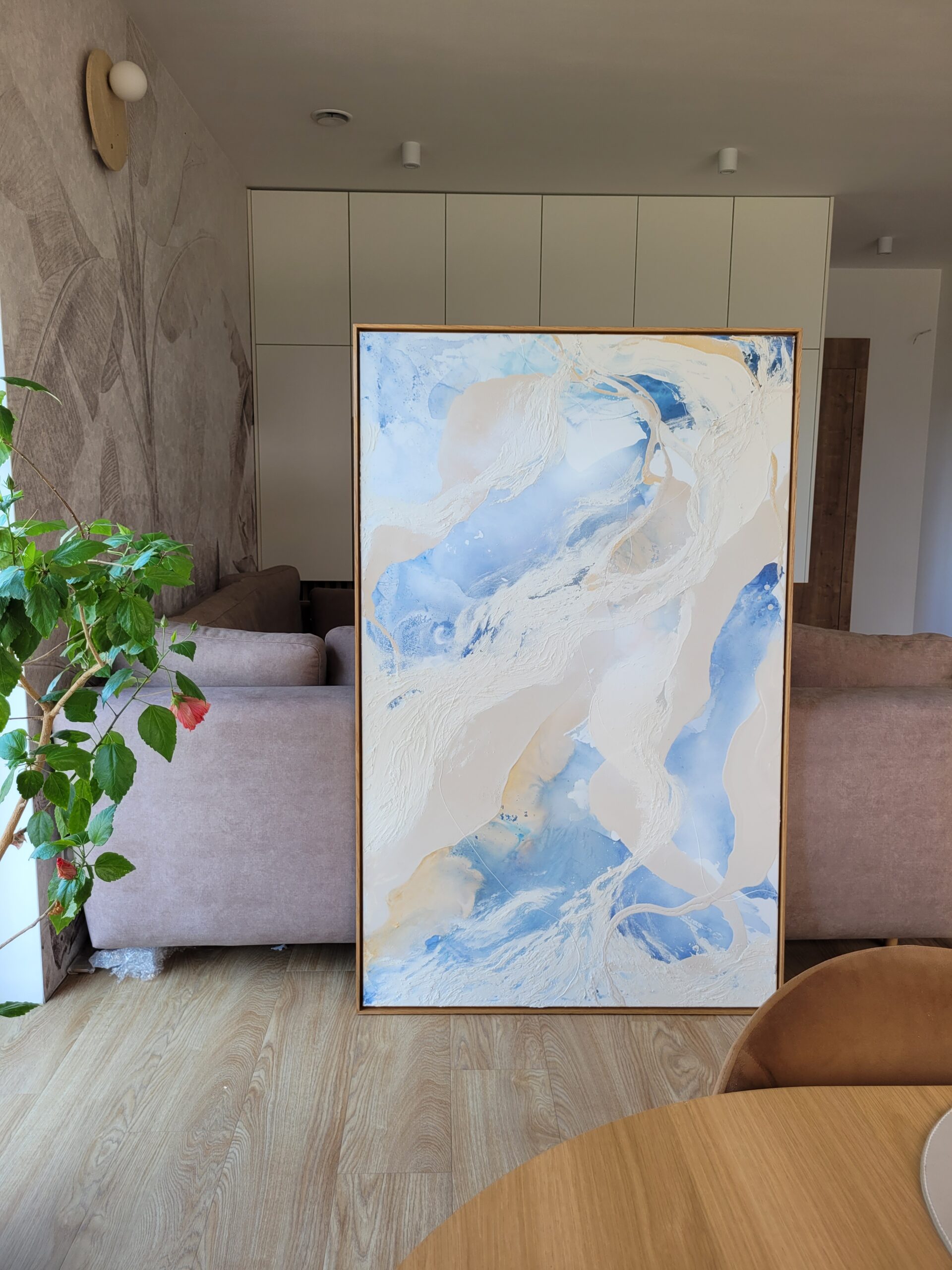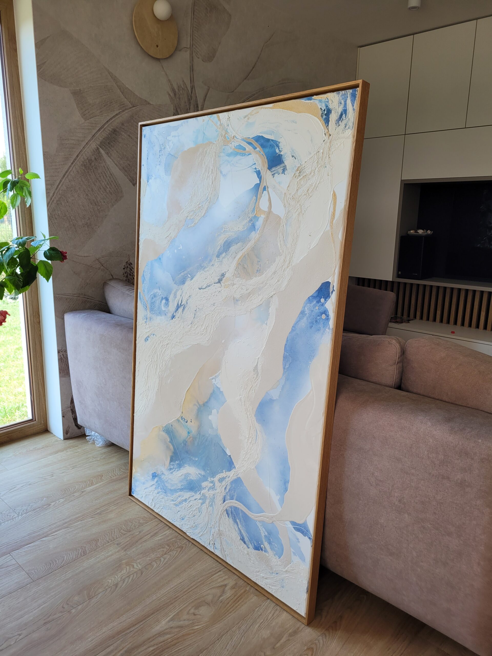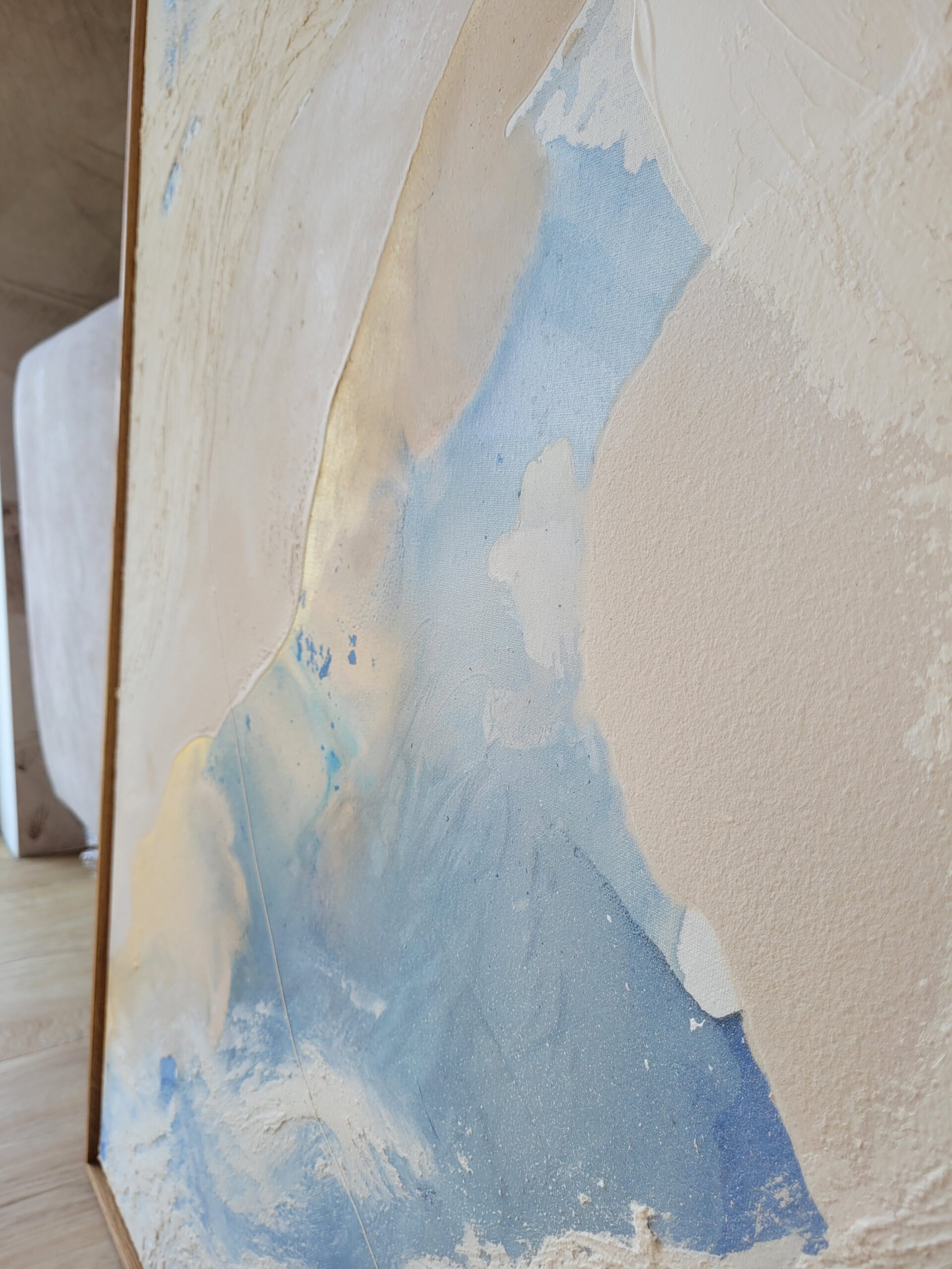 „Wybrzeże 2”, wym. 160 x 100 cm, akryl i pasty strukturalne, technika własna Ten kojący pejzaż strukturalny to morska abstrakcja. Jej lekka struktura i oceaniczne niebieskości przywołują morze, złote detale to słońce mieniące się w tafli wody, natomiast dynamiczna kompozycja imituje ruch wody. Ten obraz wzbudza spokój, ukojenie, harmonię, wspiera wyciszenie. Obraz został zabezpieczony werniksem…