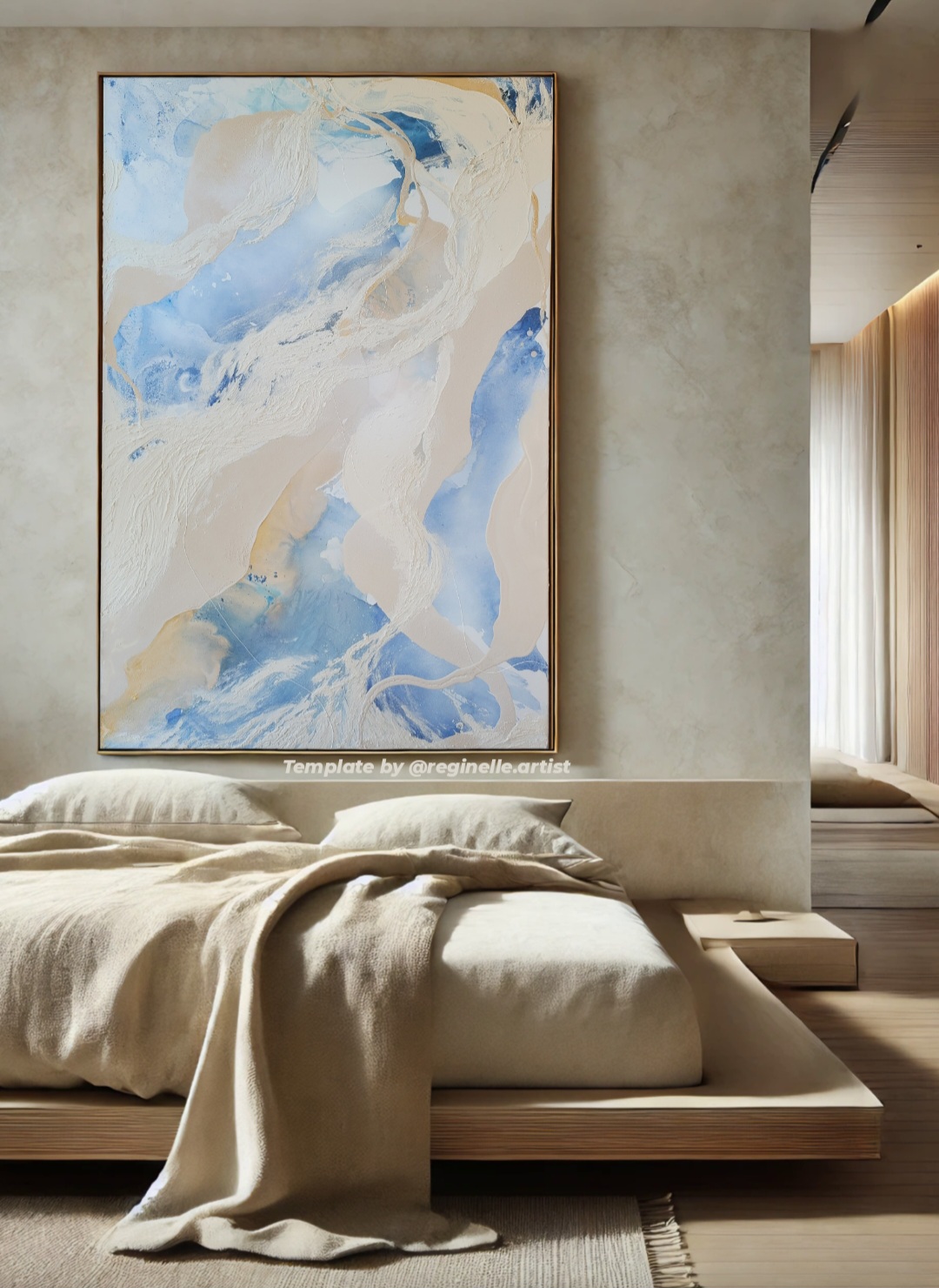 Ten kojący pejzaż strukturalny to morska abstrakcja. Jej lekka struktura i oceaniczne niebieskości przywołują morze, złote detale to słońce mieniące się w tafli wody, natomiast dynamiczna kompozycja imituje ruch wody.