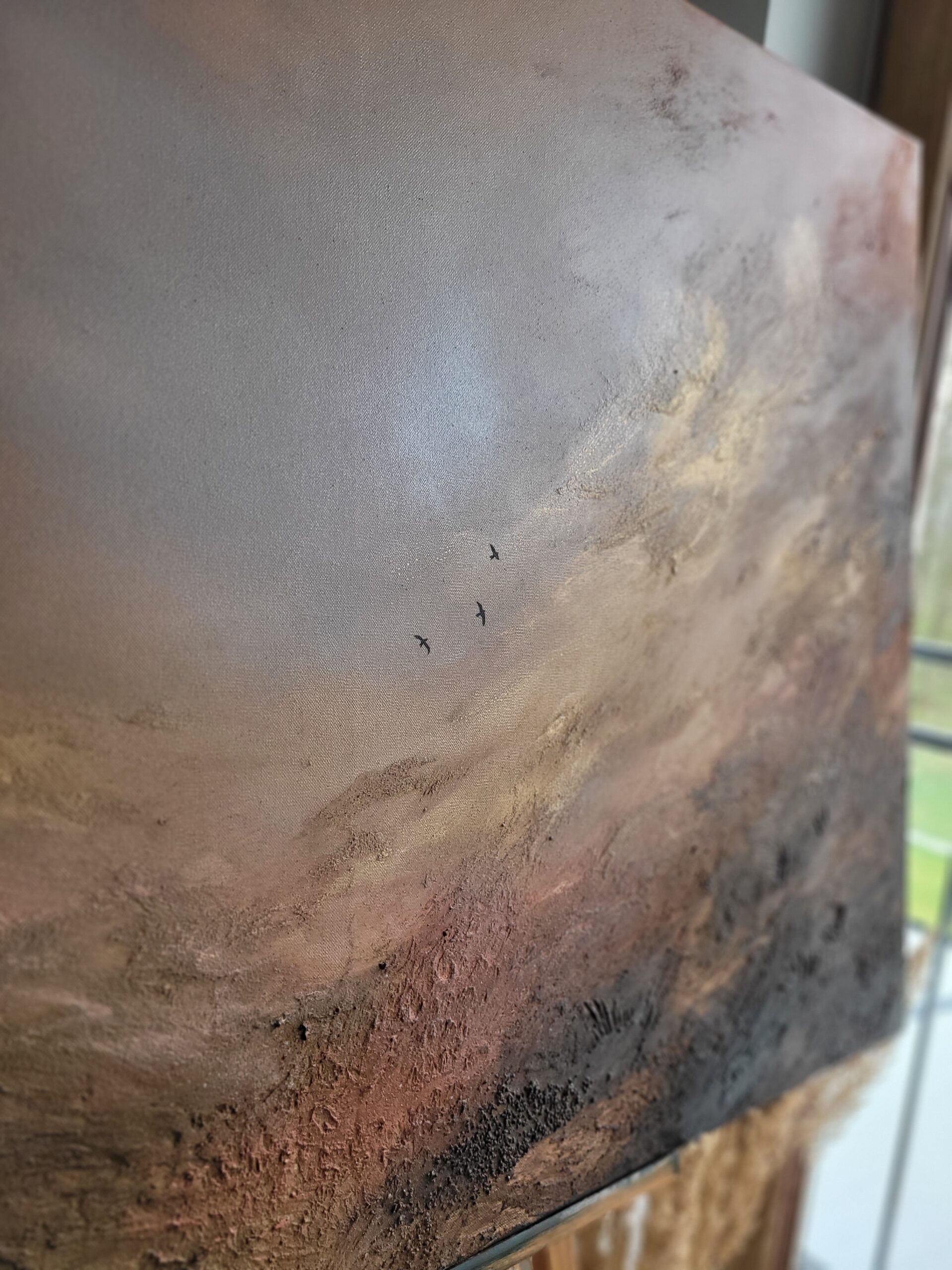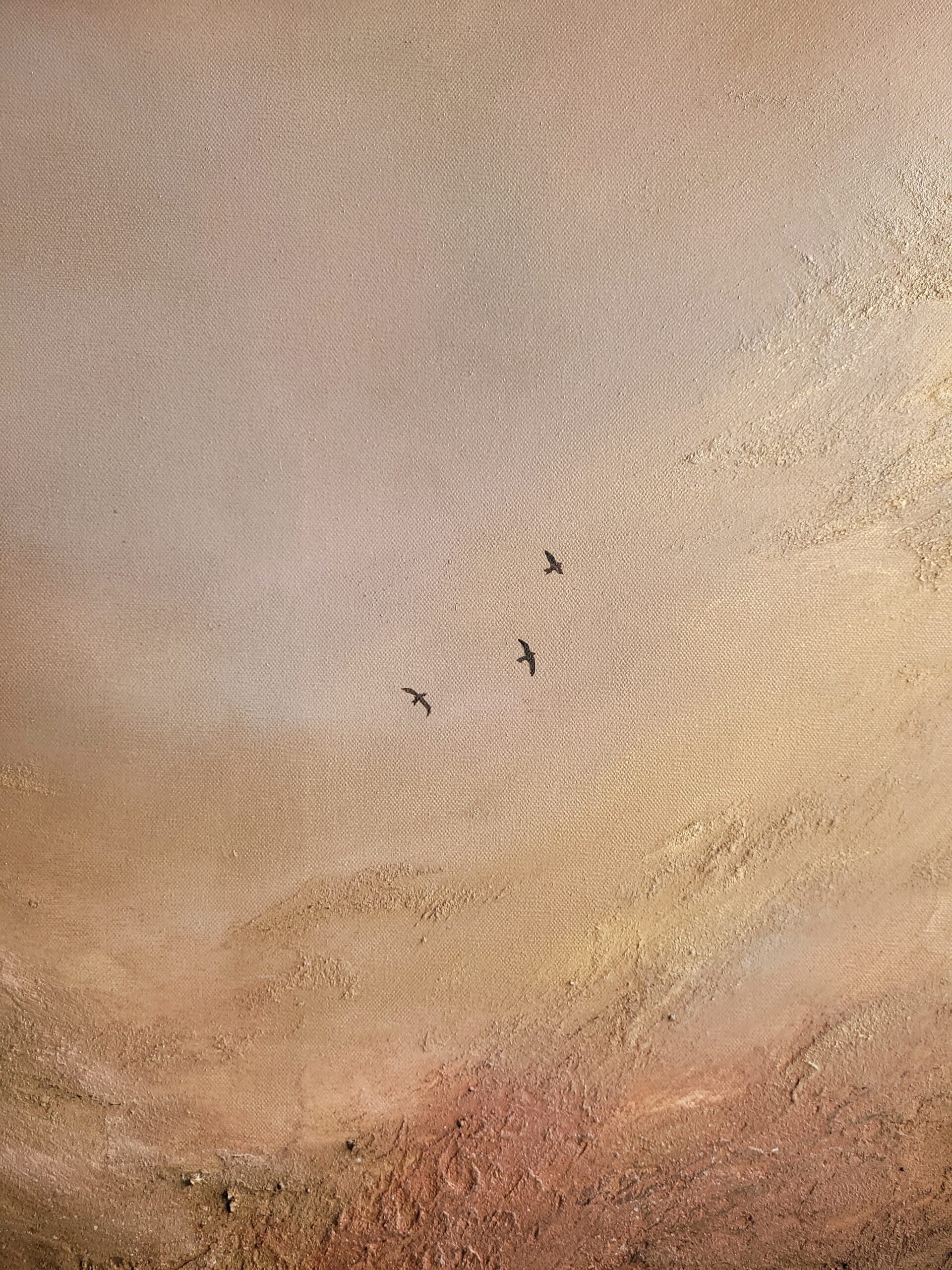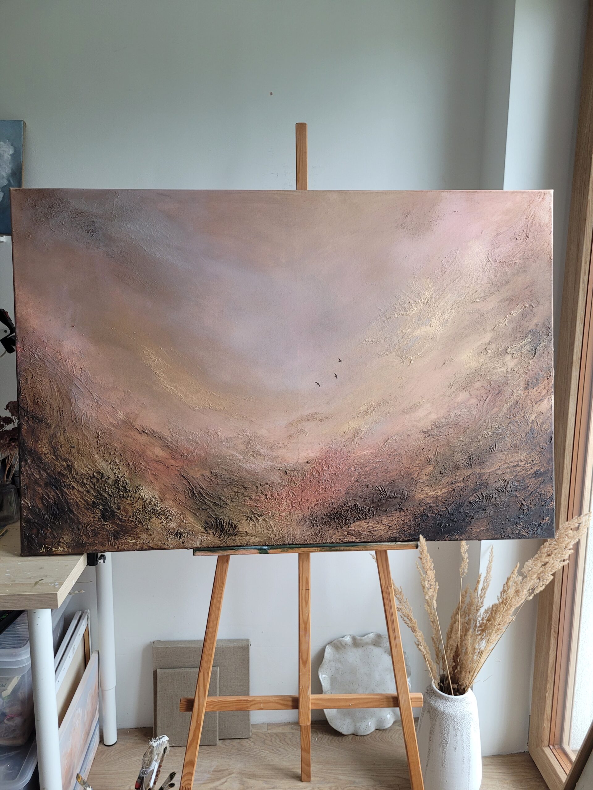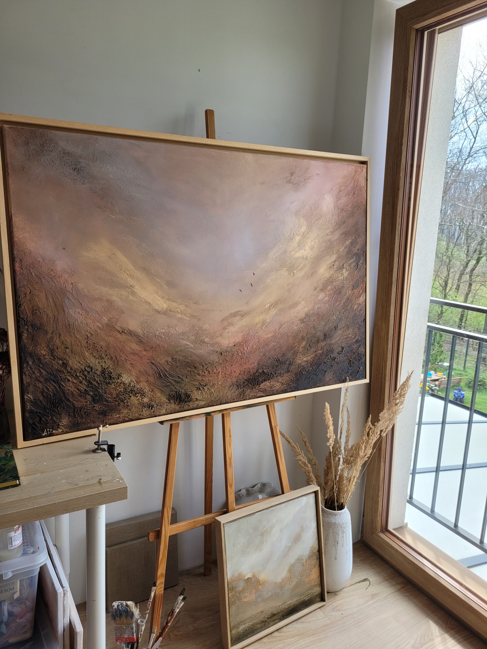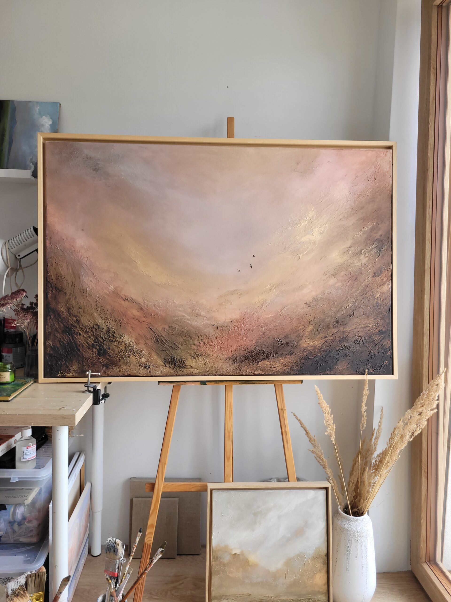 „Złota Dolina 9”, wym. 120 x 80 cm, akryl i pasty strukturalne na grubym, bawełnianym płótnie, 2026 Obraz przedstawia nastrojowy pejzaż utrzymany w ciepłej, stonowanej palecie barw. Jasne, rozproszone światło oraz faktura struktury prowadzi wzrok w głąb przestrzeni, nadając pracy wrażenie głębi i spokoju. W centralnej części, niemal ukryte w świetle dostrzec można trzy niewielkie…