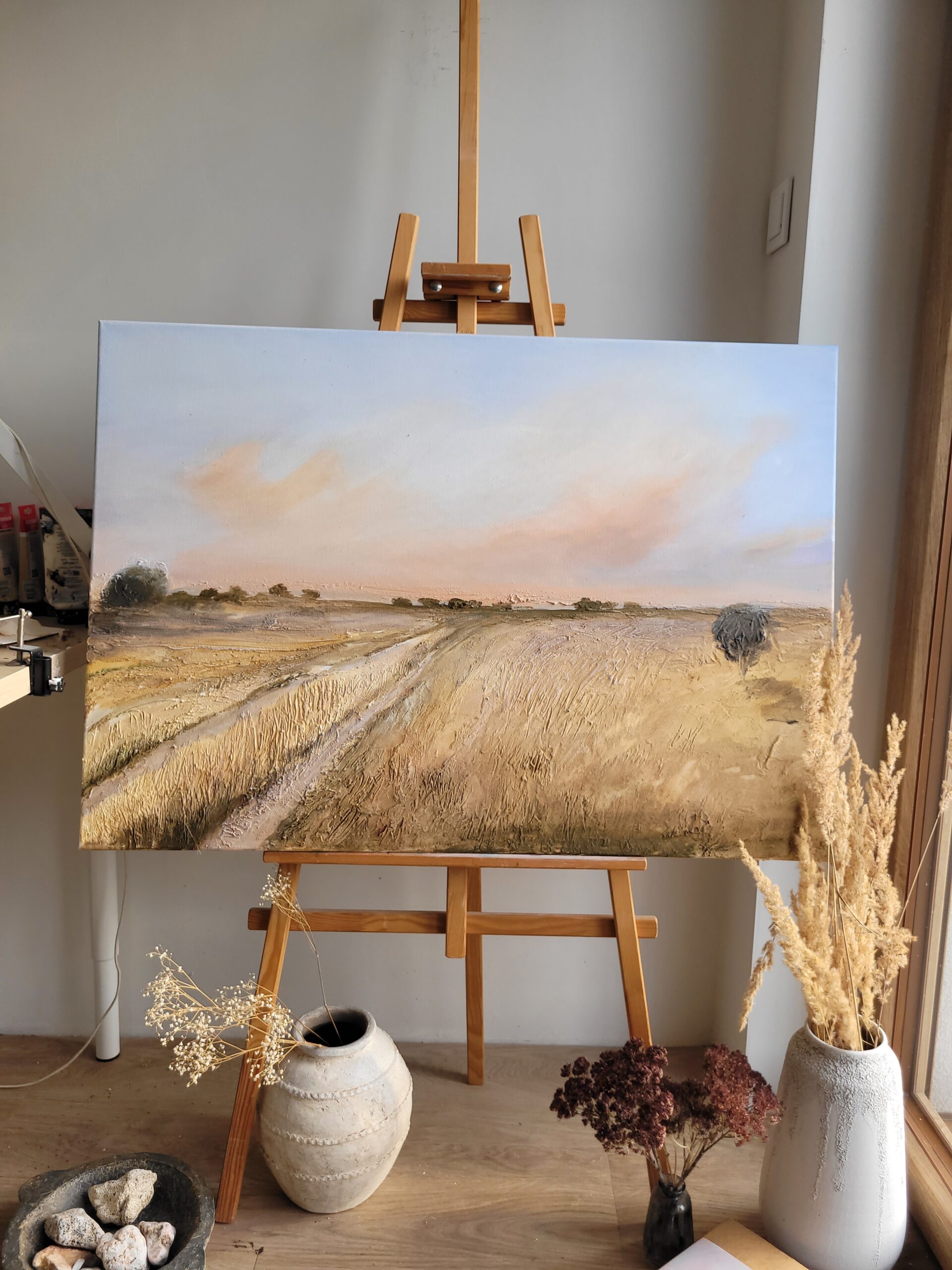 „Złote pola”, wym. 100 x 70 cm, akryl i pasty strukturalne na bawełnianym płótnie, 2025 Pejzaż strukturalny przedstawiający sielski krajobraz polny skąpany w ciepłym, wieczornym świetle. Ta pastelowa harmonijna kompozycja wprowadzi do wnętrza atmosferę ciszy, przestrzeni i natury. Strukturalna powierzchnia pięknie odbija światło, dzięki czemu prezentuje detale obrazu oraz różne jego odsłony w zależności…