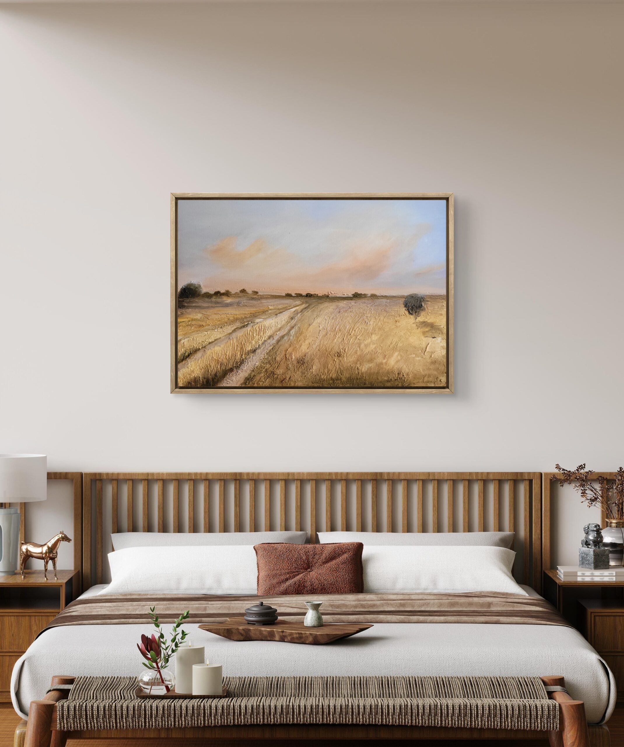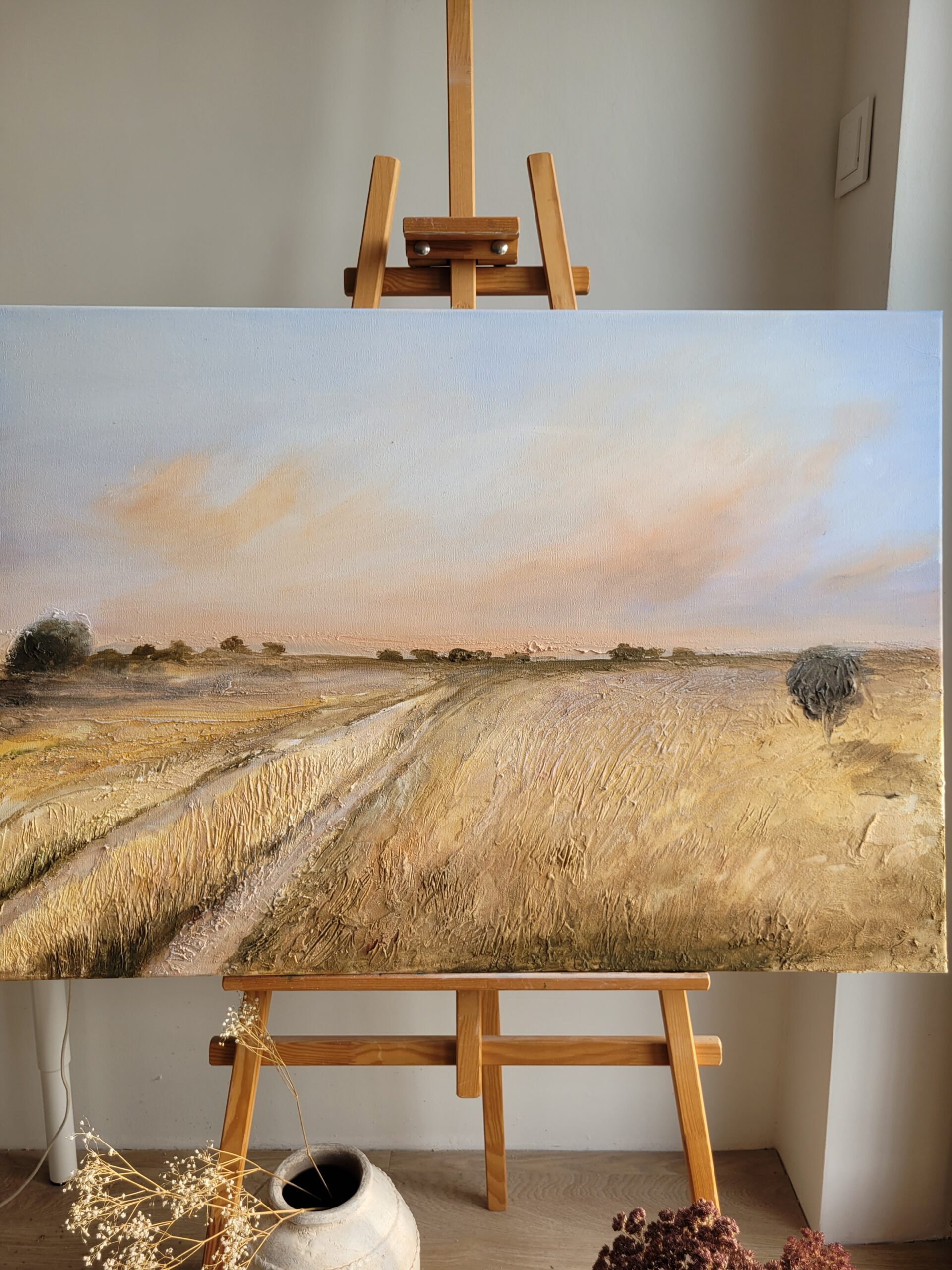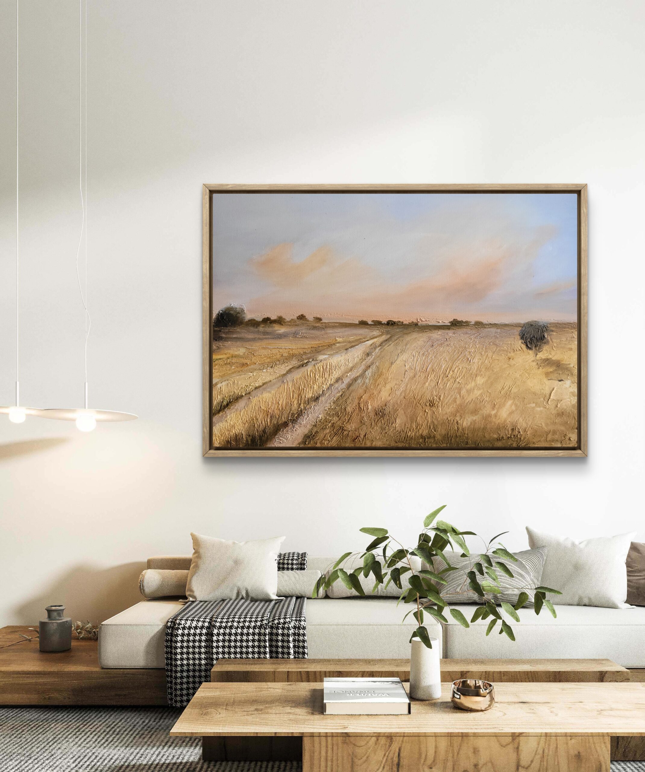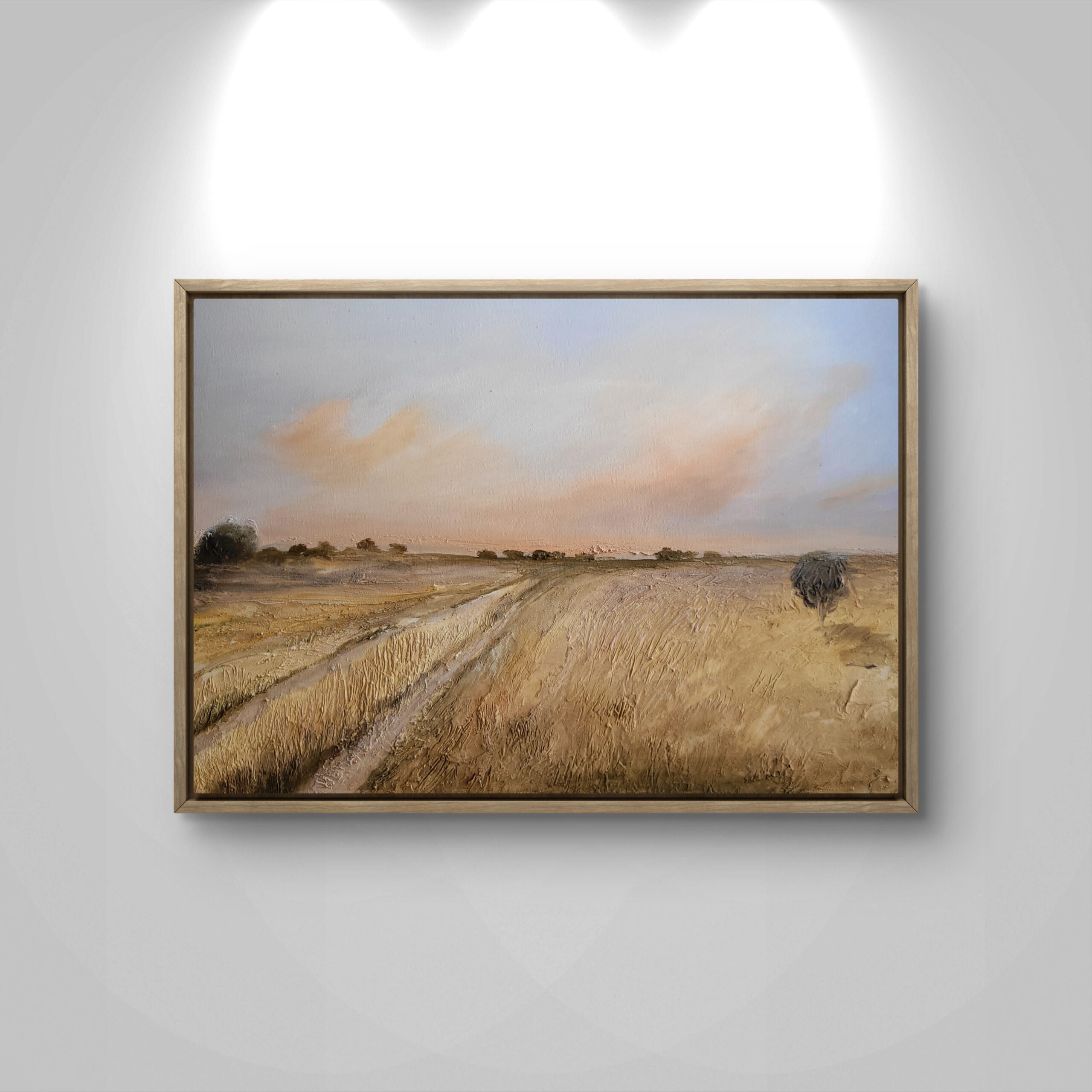 Pejzaż strukturalny przedstawiający sielski krajobraz polny skąpany w ciepłym, wieczornym świetle. Ta pastelowa harmonijna kompozycja wprowadzi do wnętrza atmosferę ciszy, przestrzeni i natury.